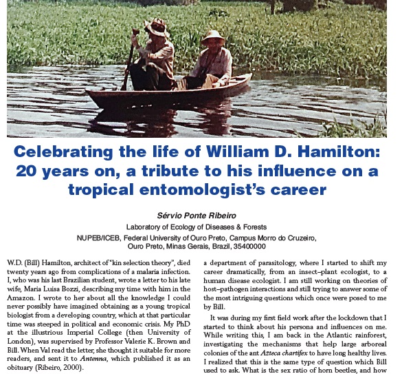Bill além de descrever as Regras de Hamilton, sobre aptidão abrangente, e resolver alguns dos enigmas darwinianos mais paradoxais, como a seleção de indivíduos não reprodutivos em uma colônia de insetos sociais, desenvolveu ao final de sua vida teorias de grande importância sobre evolução de sexo como resposta evolutiva à existência de doenças infecciosas e parasitárias. Tive a honra de ser seu orientado, na verdade, o último, e foi o legado de seus pensamentos que me lançaram definitivamente na Parasitologia e nos estudos da Ecologia de Doenças Humanas.