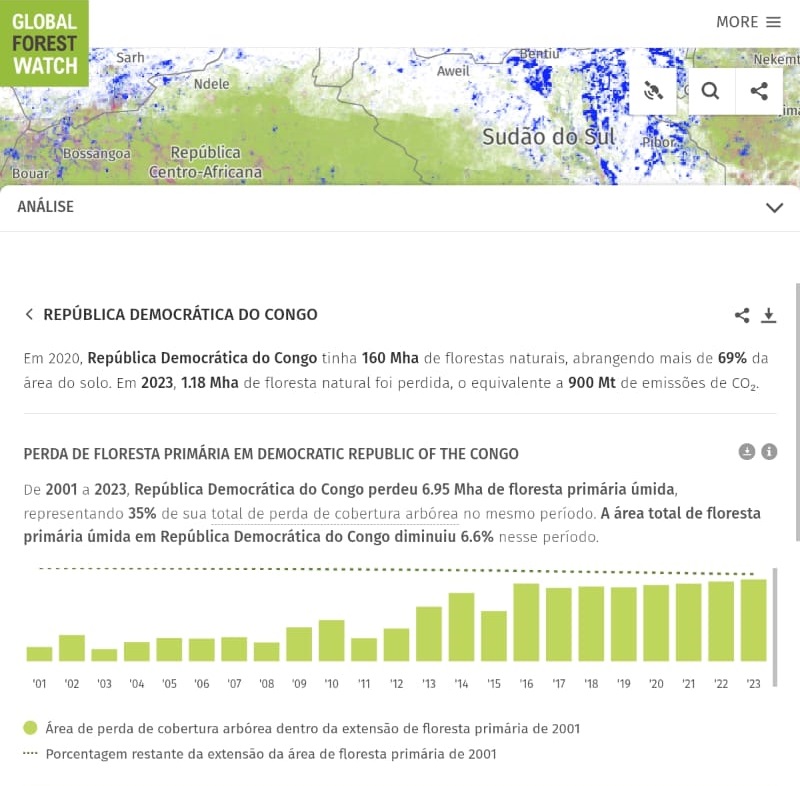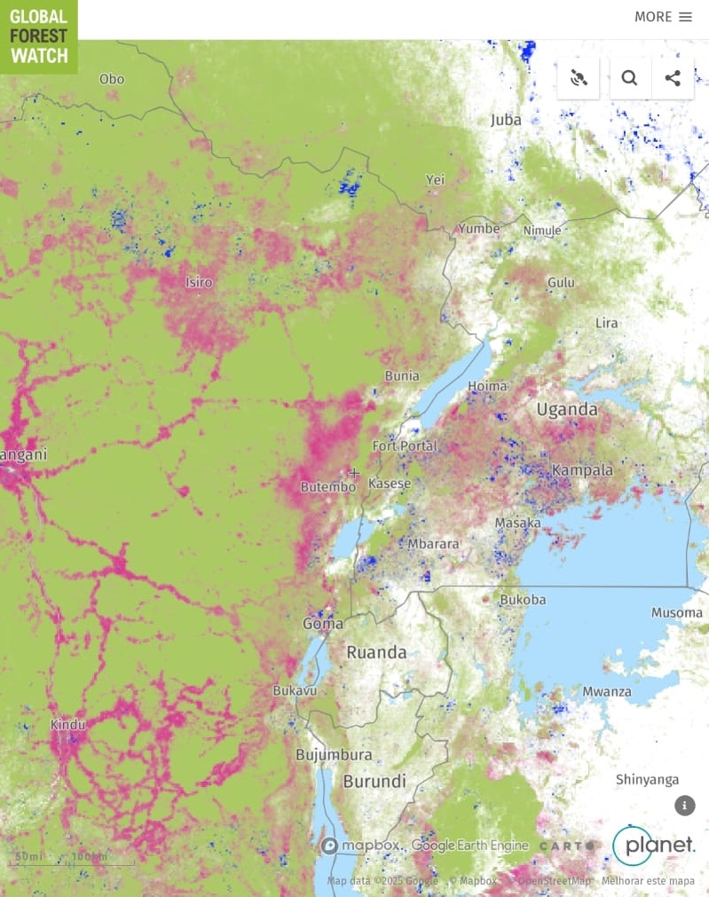 Fiz essa análise a partir de dados do Global Forest Watch (https://www.globalforestwatch.org/) que hoje em dia te permite avaliar o desmatamento e recuperação da cobertura florestal em diferentes intervalos de anos, do presente a 20 anos atrás. A figura abaixo é a região do conflito atual com os guerrilheiros do M23 (Movimento 23 de Março, que diz defender os direitos das minorias tutsi, vítimas de genocídio em Ruanda décadas atrás) + soldados de Ruanda, publicado pelo The Guardian.