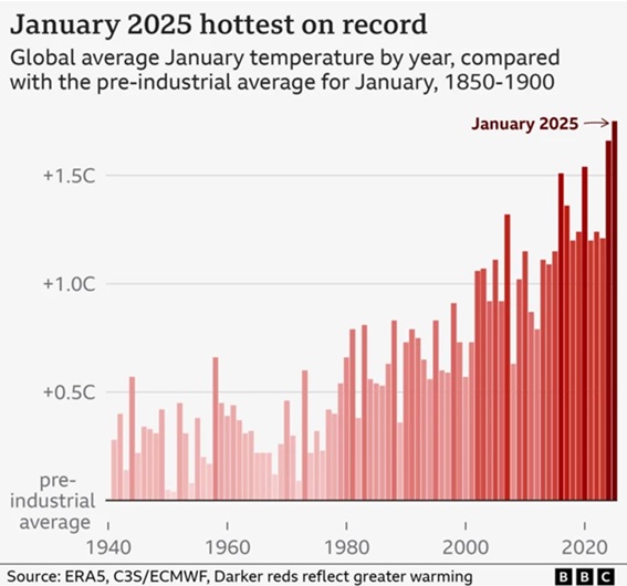 O grande aquecimento que tivemos em 2024 foi fruto da interação entre o aumento das temperaturas anuais com um El Nino extremo (por sua vez, também extremo devido ao aquecimento). Após isso, os modelos climáticos todos previam um janeiro de 2025 mais ameno por causa da La Nina, que não aconteceu. Janeiro de 2025 foi de média global de 13,23oC, 1,75% acima do pré-industrial, portanto, o mais quente da história.