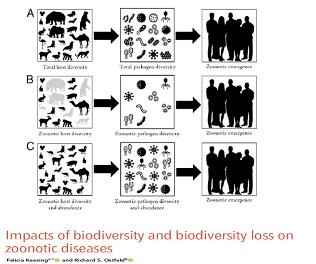 É um paradigma vigente que novas emergências de doenças relevantes estejam associadas à destruição ambiental, imprevisibilidade climática, aquecimento global, exposição humana a perturbações de habitat. Em relação a este último, há uma forte percepção de que a presença humana em ambientes sob transformação severa (frentes de desmatamento, por exemplo) pode nos expor a novas doenças emergentes. Um caso muito famoso é o transbordamento do vírus Nipah para suínos domésticos após os morcegos frugívoros buscarem refúgio em pomares, escapando do desmatamento (em expansão desde os anos 90 para produção de óleo de palma) no sudeste Asiático. Esse evento resultou em mais de 100 pessoas mortas e milhares de porcos sacrificados, em 1998. Da mesma forma, a caça de animais silvestres para consumo foi uma origem clara de várias doenças transmitidas por alimentos, entre elas, o HIV é o mais famoso.