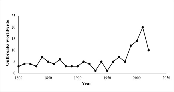 Voltando ao que o mundo moderno está fazendo com os riscos de novas epi/pandemias, vamos dar uma olhada nos eventos ao longo dos Séculos XIX, XX e XXI. Ao longo das 22 décadas entre 1800 a 2020, 48 doenças diferentes causaram algum tipo de surto disruptivo na humanidade, entre doenças humanas clássicas e doenças zoonóticas emergentes que recentemente se espalharam para nós. No século XIX, apenas 13 patógenos causaram surtos detectáveis, mas a maioria era recorrente, como tifo, peste, cólera, febre amarela e varíola. No século XX, 19 novas doenças emergentes foram adicionadas, e 16 novas apenas nas duas primeiras décadas do século XXI (8 novos patógenos/década contra 1,9 no século anterior). Isso é um aumento substancial na diversidade de doenças, embora possa haver alguma subestimação no número de patógenos do século XIX e início do século XX. Por exemplo, várias espécies diferentes de bactérias que podem causar disenteria e espécies de vírus que causam gripe são improváveis de serem devidamente identificadas naquele momento. Mesmo assim, e mais importante, não apenas o número de novas espécies de patógenos está aumentando, mas também o número de surtos por década.