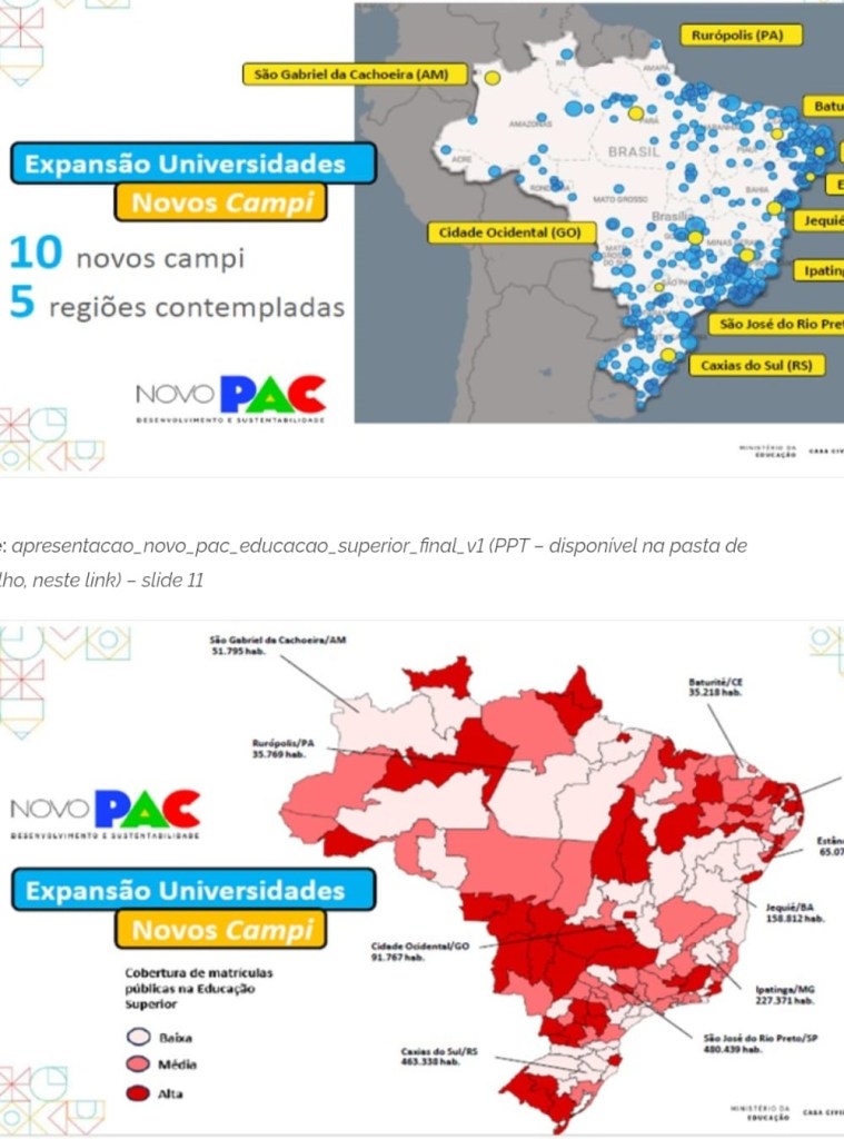Finalmente, a proposição de novos Campi para o Brasil, que vem já com uma boa notícia nesses gráficos abaixo. Se parar para pensar, que país em desenvolvimento tem essa cobertura de acesso ao ensino superior? Claro, nem tudo são rosas, e não estamos felizes com verbas indo para expansão, quando temos que implorar dinheiro de emendas para recuperar e melhorar os campus já existentes. A manutenção dos cursos existentes é um desafio, com quase nenhuma verba garantida, enquanto temos verbas marcadas para expansão. Não gosto disso também, mas se não se cria, não se tem absorção dos doutores que vamos formando, nem a pressão necessária para aumentar os investimentos no ensino superior e na pesquisa.