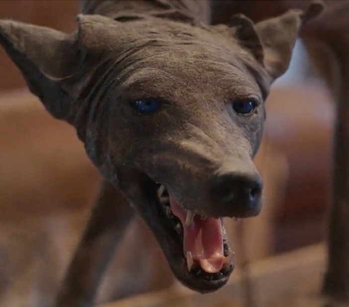 O chupacabra capturado e morto no Texas, um coiote doente! Ainda que fácil de identificar e diagnosticar, foi exibido por anos como uma criatura fantasmagórica! Foto de Kristen Cabrera do Texas Standard: (https://www.texasstandard.org/stories/cuero-texas-chupacabra-ranch-cryptid-sightings/)